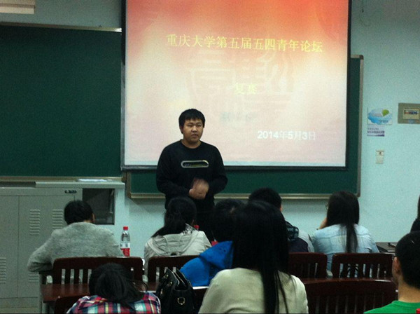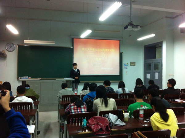 “畅论五四精神,争做时代青年”,2014年5月3日18:30-20:30,重庆师范大学中国特色社会主义理论体系学习研究会联合重庆大学马研会、四川外国语大学马研会在重庆大学赛区举行了第五届“五四青年论坛”复赛。