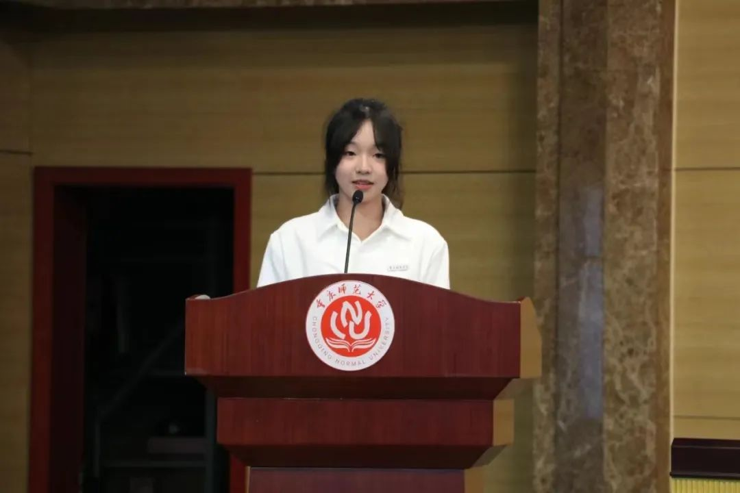 议程第二项:教师代表陈沉老师发言。陈沉老师首先对2023级新生的到来表示热烈欢迎,并希望各位新生明白大学之根本在“学”,专业之根基在“信”,事业之根源在“行”,并祝愿新生能够在大学之学的根本上自信,在专业自信的根基上笃行,努力践行“学高为师、身正为范”的重师校风。