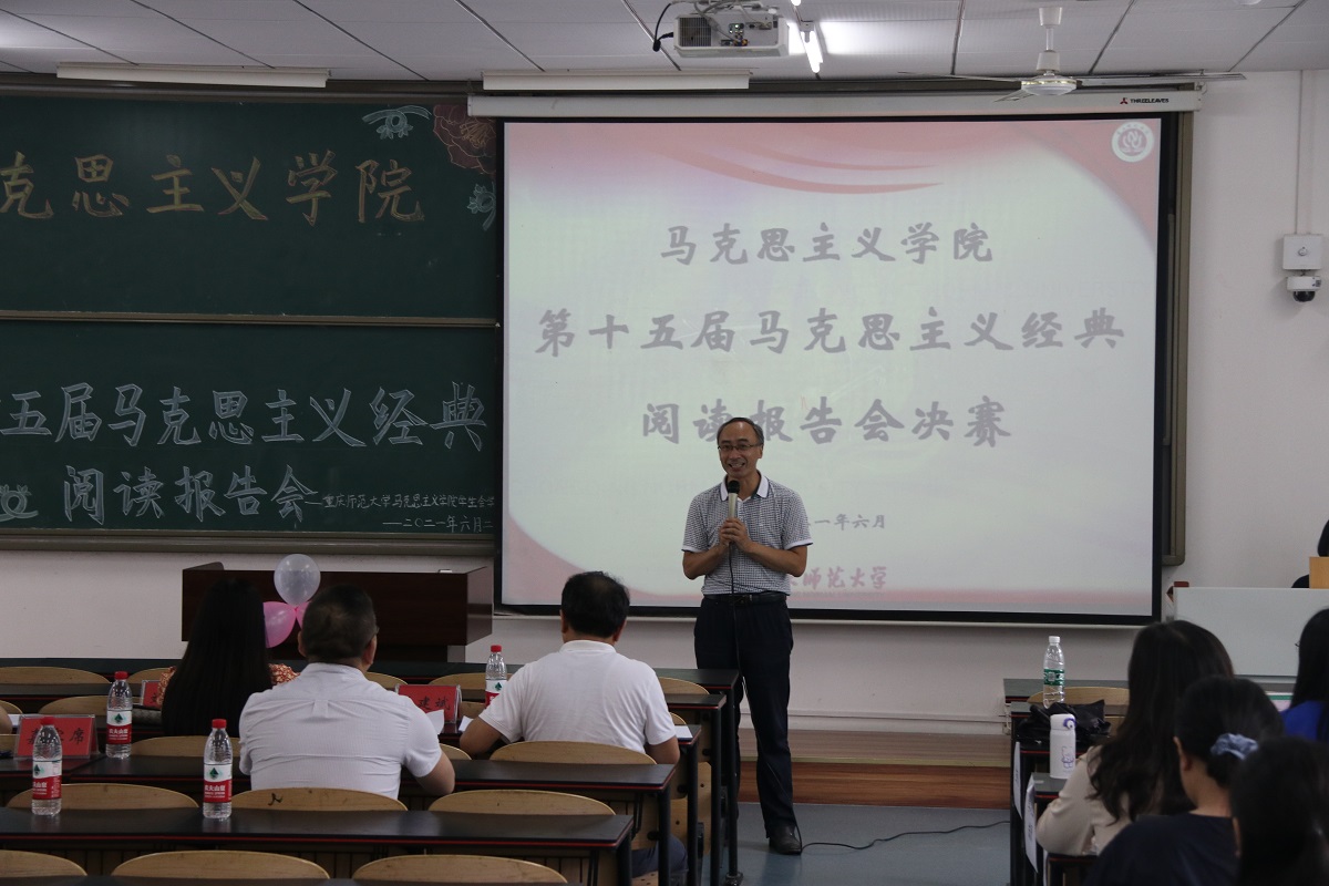 选手展示完毕后,评委进行点评。刘忠荣老师充分肯定了本次活动的意义,并从选手仪态、报告内容等方面对参赛选手的精彩表现给予了高度赞扬。同时刘老师提出建议,希望同学们在读书报告会上应该多增添一些经典读物的内容挖掘、分析,“将内容落地”。最后,刘老师殷切寄语在座同学,“读书千遍,其义自见”,多读、精读马克思主义经典读物一定会有所长进、对自身有所裨益。