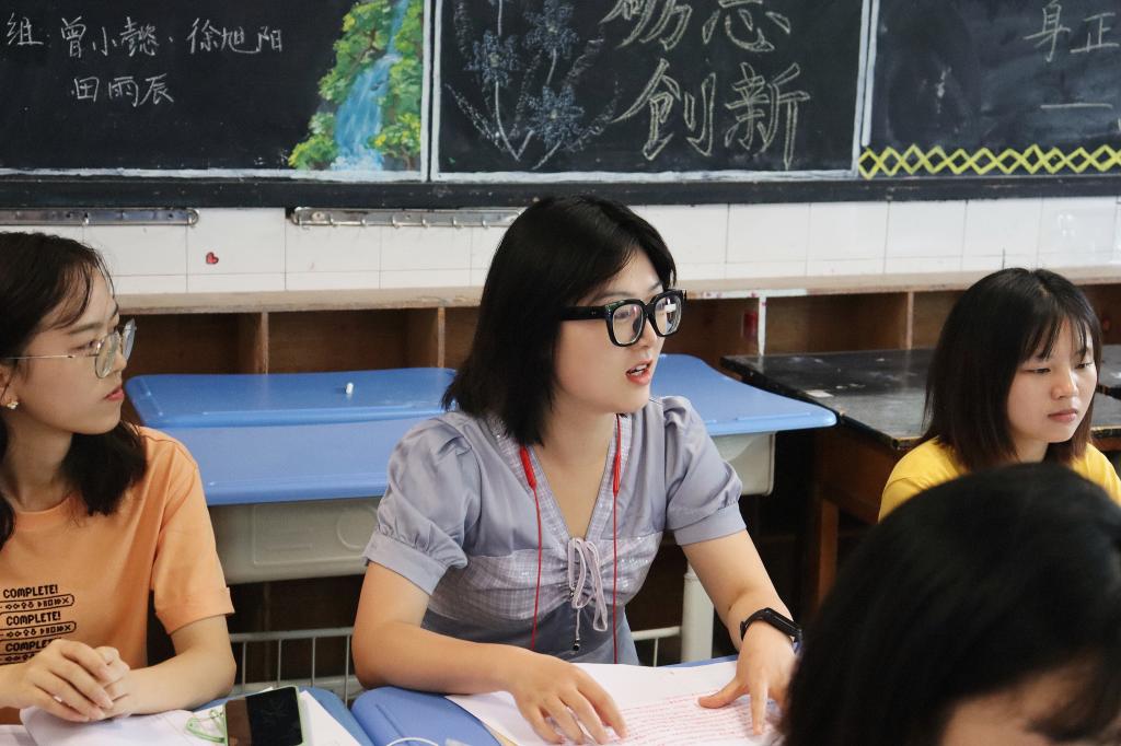 实习组长张籽言同学汇总实习组同学们的工作量、工作内容、工作状态和收获,谈到融入鱼洞中学的每一天,参与的每一项活动,给了同学们成长的平台,师范生技能和素质在实习中得到很大提高。