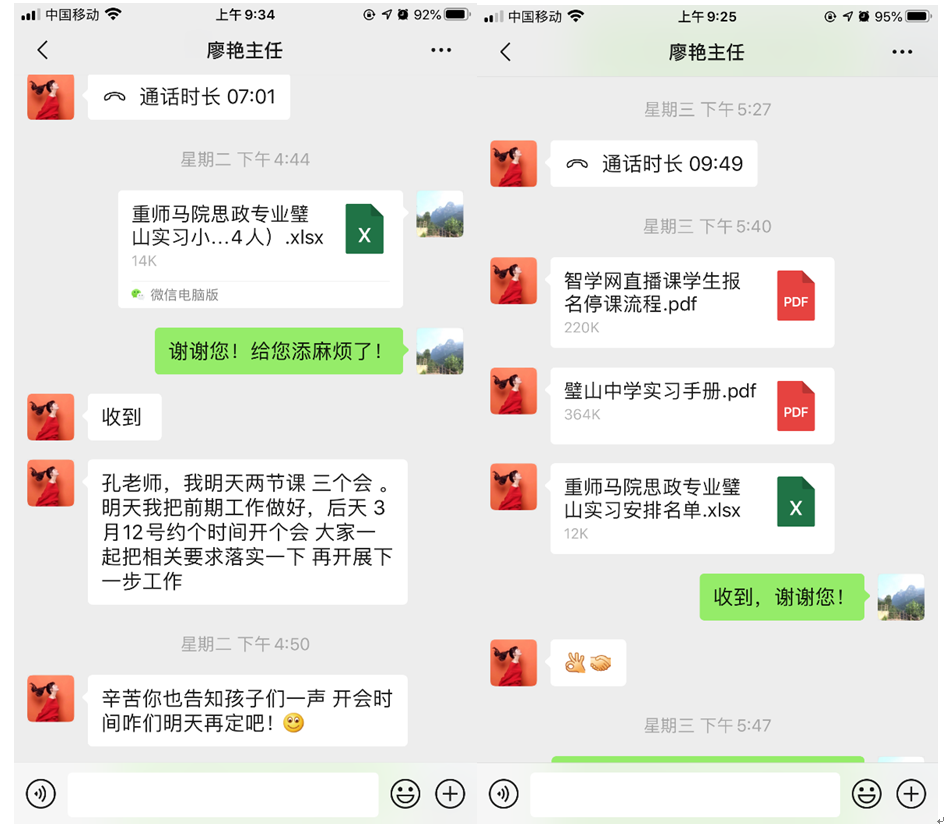 在疫情影响下,秉持着“停课不停学”的原则,重庆市璧山中学于3月2日便启动了线上教学,而我们也开始了一次别开生面的实习之旅。3月5日,我们的实习带队老师孔庆茵老师与璧山中学廖艳主任进行了有关实习工作安排的交流,并邀请璧山中学参与此次实习的老师入群。随后小组确定实习规章制度、进行实习小组分工等工作。廖主任发来了智学网直播课学生报名听课流程、璧山中学实习手册、重师马院思政专业璧山实习安排(落实指导教师、登录科大讯飞平台听课的账号密码)。并于3月12日以腾讯线上会议的形式召开了实习见面会。