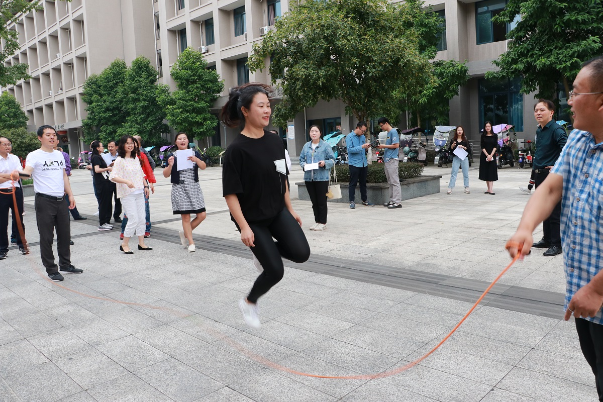 外广场,大家积极参加跳绳比赛活动。集体跳长绳项目,由工会同志组织老师们抽签按6人一组随机分组,共有6个小组参加了此项比赛;个人跳短绳项目采取自由报名方式进行,先后有15人次参与了此项比赛。经过激烈的角逐,2分钟集体计时跳长绳项目由刘寿堂、许姗姗、刘龙等11人获胜;1分钟计时个人跳短绳项目由张晓庆、高德华、赵艳华等12人获胜。获胜者以绝对的实力成为本季度当之无愧的跳绳“健康达人”。