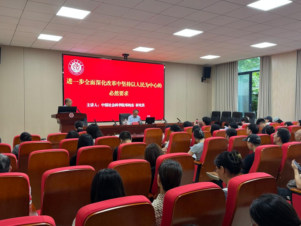 讲座结束后,副院长田方林教授对邓纯东研究员的讲座高度评价。他认为,邓教授的讲座政治站位高、理论内涵深、实践指导性强,既有深刻的理论阐释,又有生动的实践案例,既有国际视野的历史比较,又有立足国情的发展思考。同时,田院长还为大家分享了三点学习体会:一是作为党员同志,在学术研究中要善于提高自己的政治战略高度;二是作为教学科研人员要深入思考怎样拓展学术研究的思路;三是作为教师,在今后的教学活动中要积极将课本内容与案例深度融合。